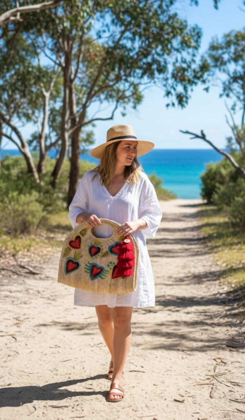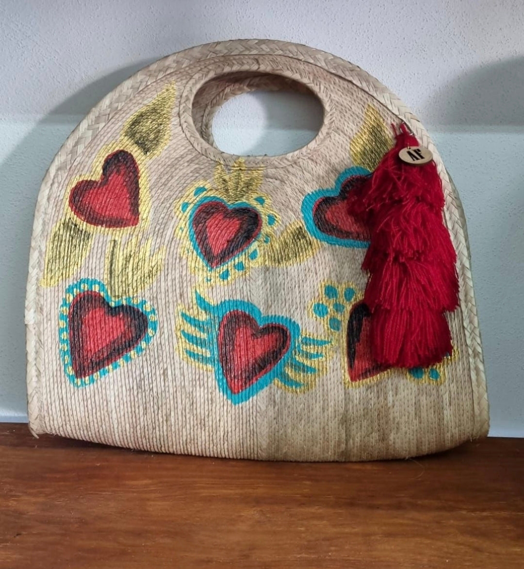 bolsa de Palma con asas redondas con corazon con alas pintado a mano
