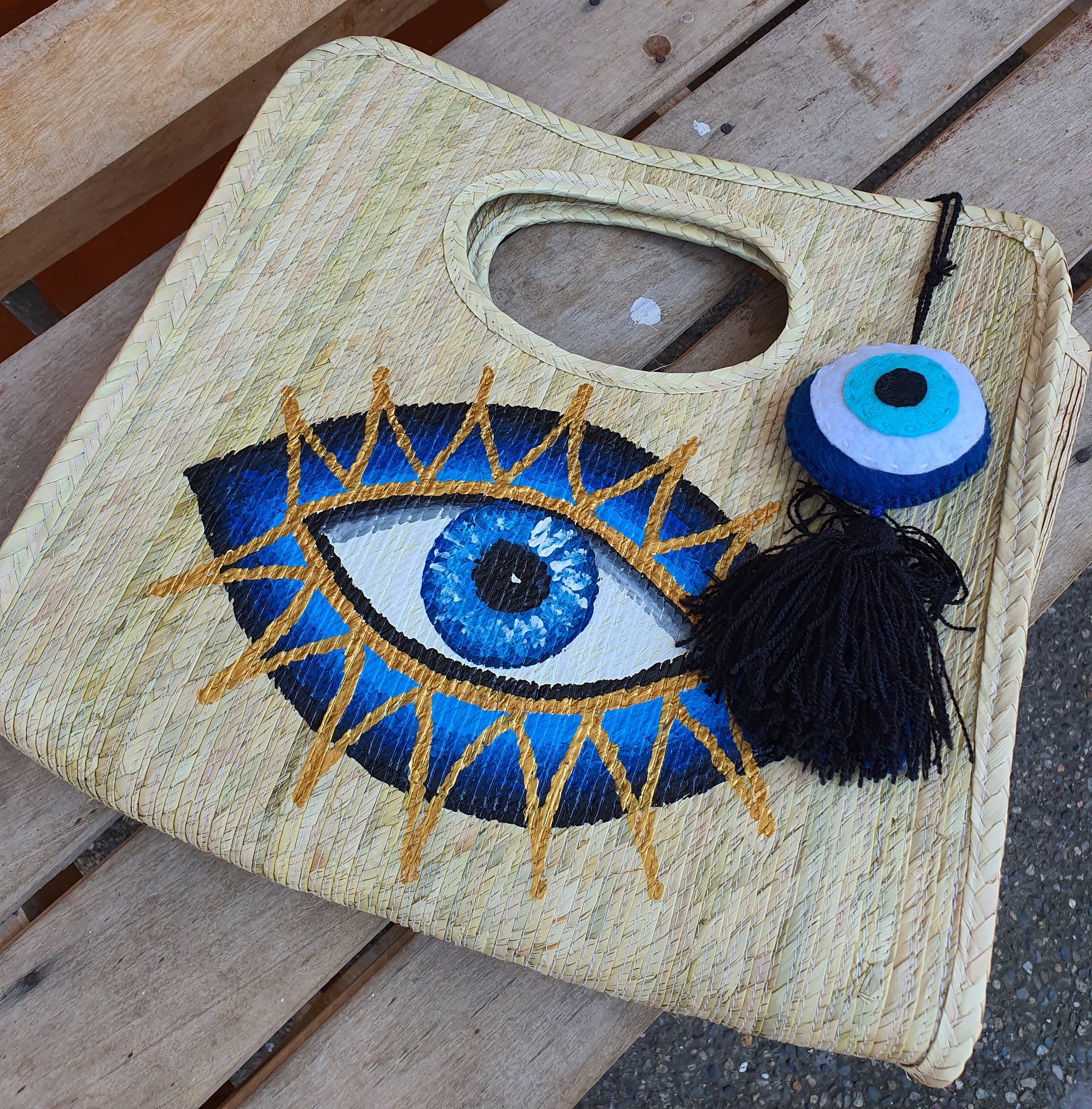 Bolsa hecha de hoja de palma, fibra natural pintada a mano, con llavero de ojo con borlas.